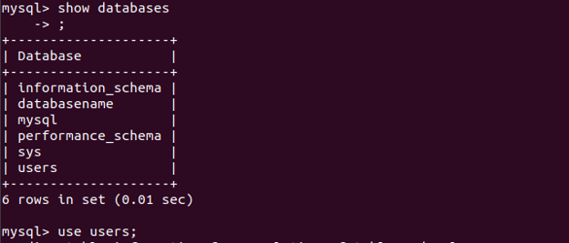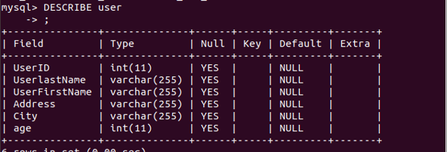 在下面的示例中,我們正在數(shù)據(jù)庫用戶中創(chuàng)建一個表用戶。請在屏幕上瀏覽下面的示例。