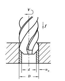 擴(kuò)孔是用擴(kuò)孔鉆在工件上已經(jīng)鉆出、鑄出或鍛出孔的基礎(chǔ)上做一步加工,以擴(kuò)大孔徑,提高孔的精度,降低粗糙度。擴(kuò)孔的尺寸精度等級可達(dá)IT10~I(xiàn)T9,表面粗糙度R a值可達(dá)6.3~3.2。擴(kuò)孔加工如圖5.2.30所示。一般情況下,擴(kuò)孔余量(D- d)取為0.5~4 mm。